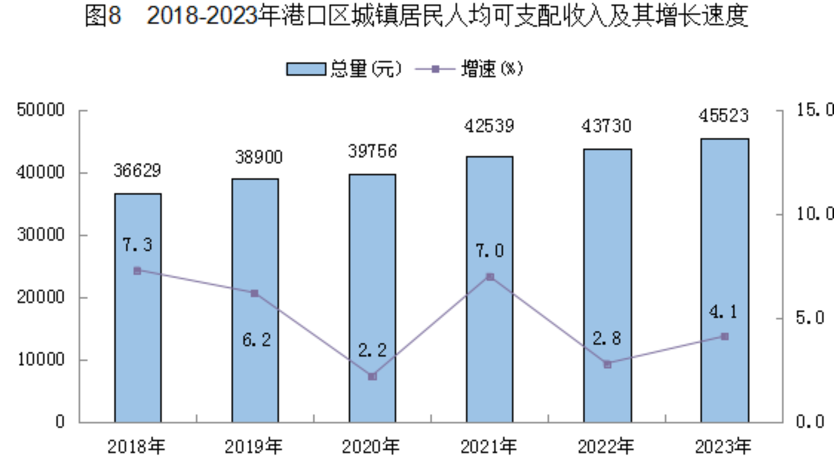 2023年,城镇居民人均可支配收入45523元,比上年增加1793元,增长4.1%。城镇居民人均生活消费支出26252元,增长8.2%。农村居民人均可支配收入23703元,增加1633元,增长7.4%。农村居民生活人均消费支出13722元,增长5.4%。