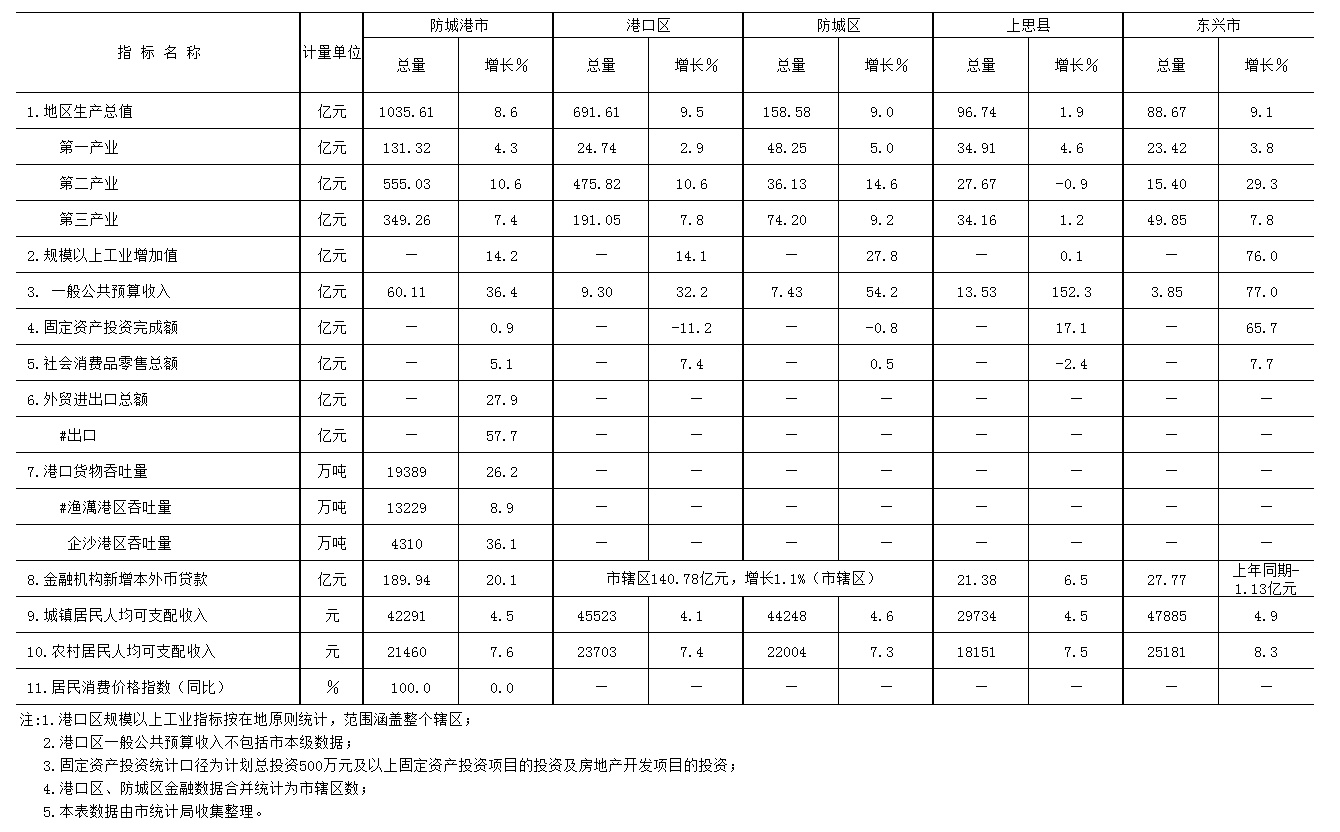2023年防城港市及各县(市、区)主要经济指标完成情况表