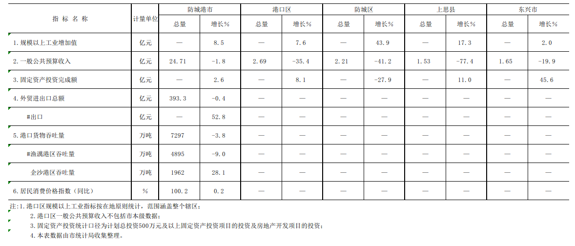 2024年1-5月防城港市及各县(市、区)主要经济指标完成情况表