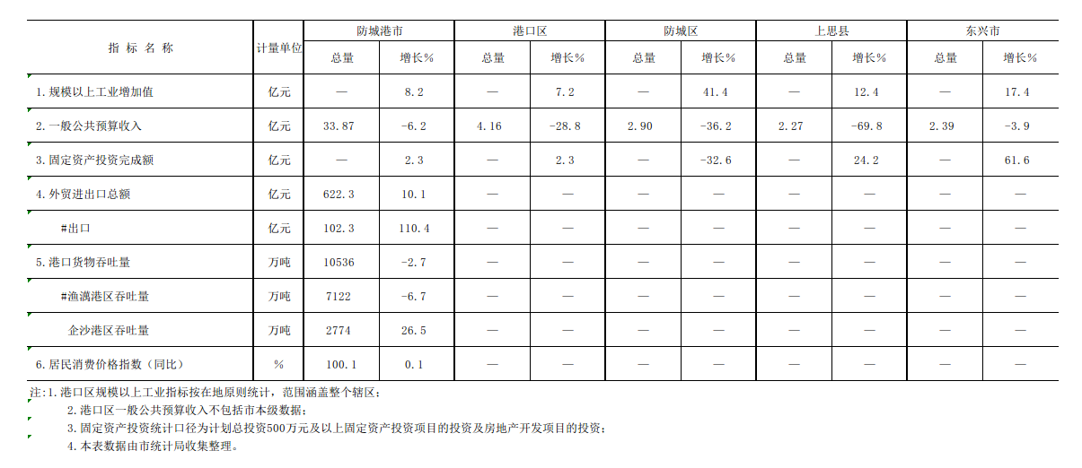 2024年1-7月防城港市及各县(市、区)主要经济指标完成情况表