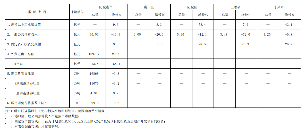 2024年1-11月防城港市及各县(市、区)主要经济指标完成情况表