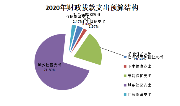 2020年财政拨款收支总预算3934.58万元。收入全部为一般公共预算拨款;支出3934.58万元,包括:社会保障和就业支出135.06万元、卫生健康支出77.37万元、节能保护支出800万元、城乡社区支出2824.95万元、住房保障支出97.20万元。