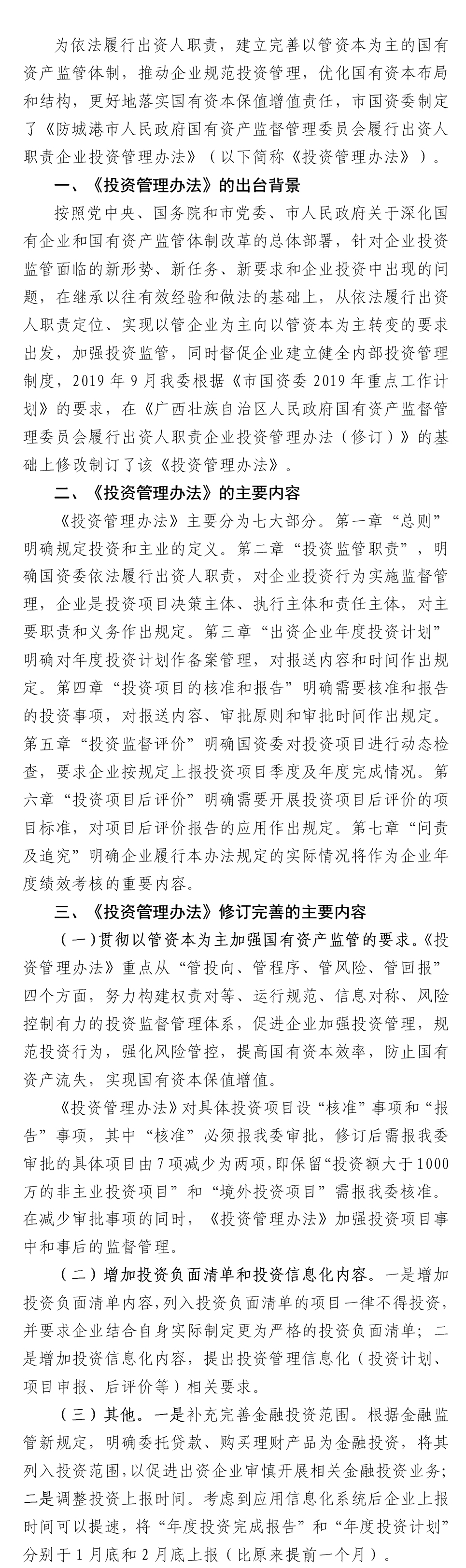 《防城港市人民政府国有资产监督管理委员会履行出资人职责企业投资管理办法》 的解读