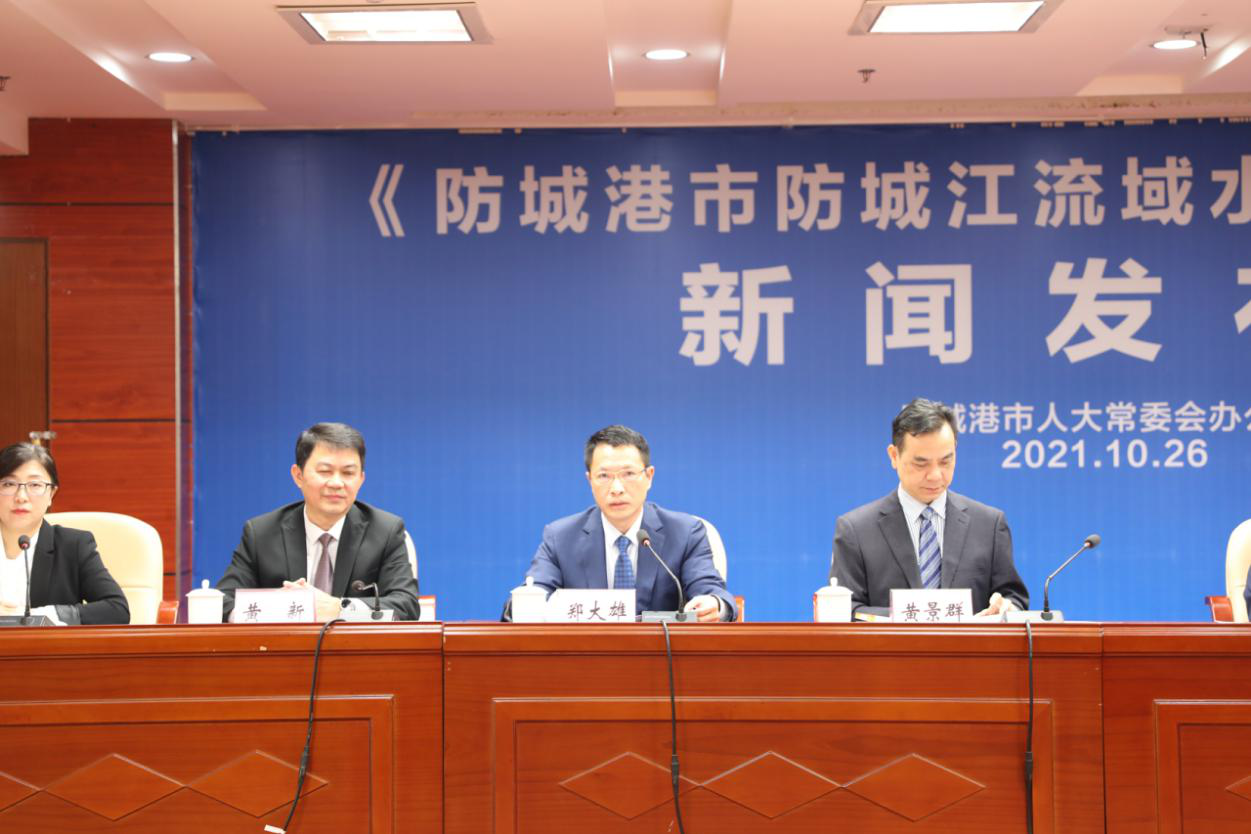图为《防城港市防城江流域水环境保护条例》新闻发布会上记者提问