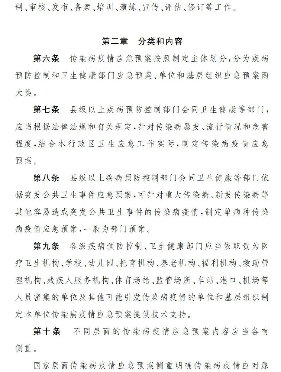 《传染病疫情应急预案管理办法》分为总则、分类和内容、预案编制、审核发布和备案、培训演练和宣传、评估和修订、保障措施、附则等8章共35条。