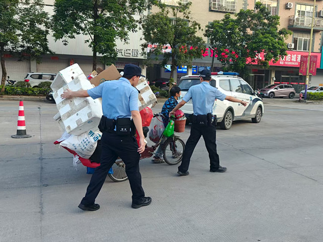 几分钟后,老人状态逐渐好转,说自己没事了,想继续推车回家。考虑到路面车流量大,且老人刚刚中暑,民警李祥烨主动提出帮忙。两人合力将沉重的手推车推至安全区域,又反复叮嘱老人高温天尽量减少外出,注意防暑。老人对民警的暖心之举不住地感谢。