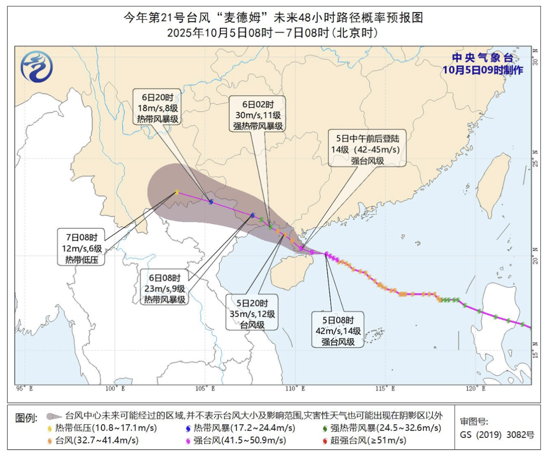 据气象部门预计,受台风“麦德姆”环流影响,5 日白天我市风力逐渐加大,5日下午至6日我市将有一次强风雨天气过程,我市大部有暴雨到大暴雨,累计雨量150~180毫米、局地250毫米以上,最大小时雨量40~60毫米,局地80毫米;陆地最大阵风11~13级,北部湾海面最大阵风14~15级。