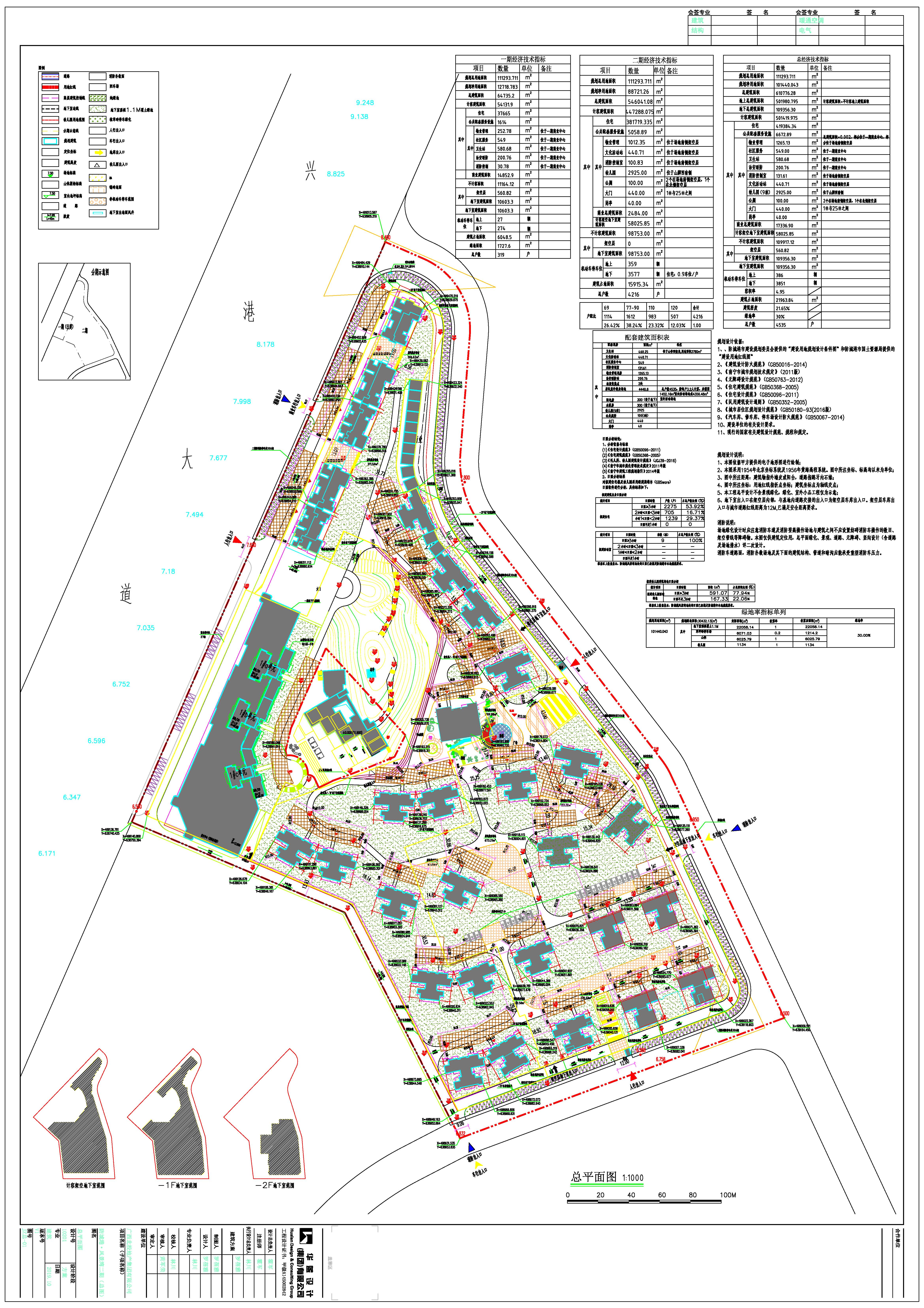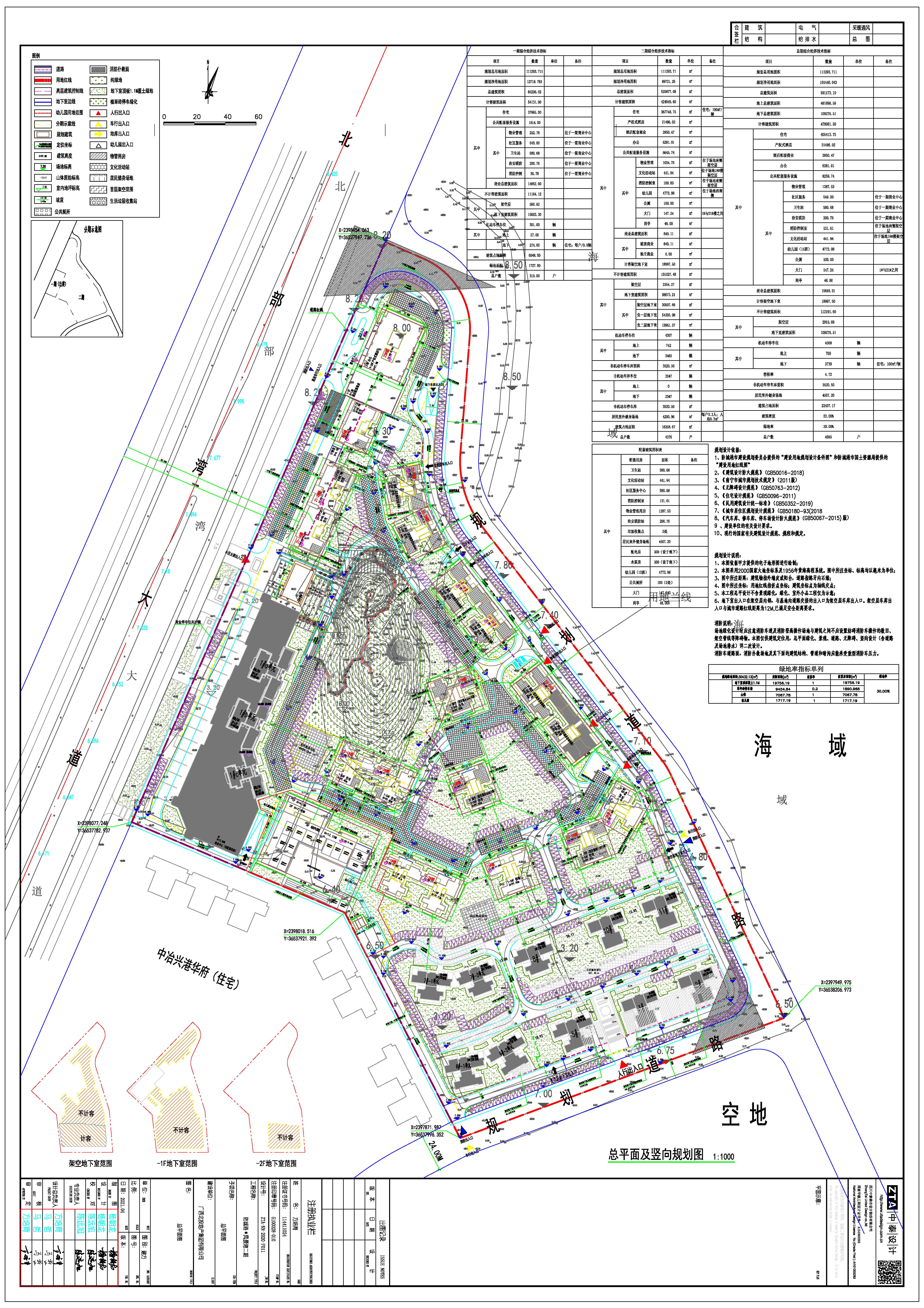 (二)总平面规划设计方案:总用地面积111293.711㎡,净用地面积101440.043㎡,总建筑面积591173.10㎡,计容建筑面积478981.50㎡〔其中住宅405413.75㎡,产权式酒店21486.02㎡(须补充土地变更手续),酒店配套商业2850.47㎡,办公6281.01㎡,物业管理1287.53㎡,社区服务549.00㎡,卫生站580.68㎡,治安联防200.76㎡,消防控制室131.61㎡,文化活动站441.94㎡,幼儿园4772.98㎡,公厕100.00㎡,大门147.24㎡,岗亭48.00㎡,商业总建筑面积15693.01㎡,计容架空地下室18997.50㎡〕,不计容建筑面积112191.60㎡(其中架空层2915.09㎡,地下室建筑面积109276.51㎡),容积率为4.72,建筑密度为22.09%,绿地率为30.00%,机动车停车位4508个(地上769个,地下3739个),规划总户数为4695户。
