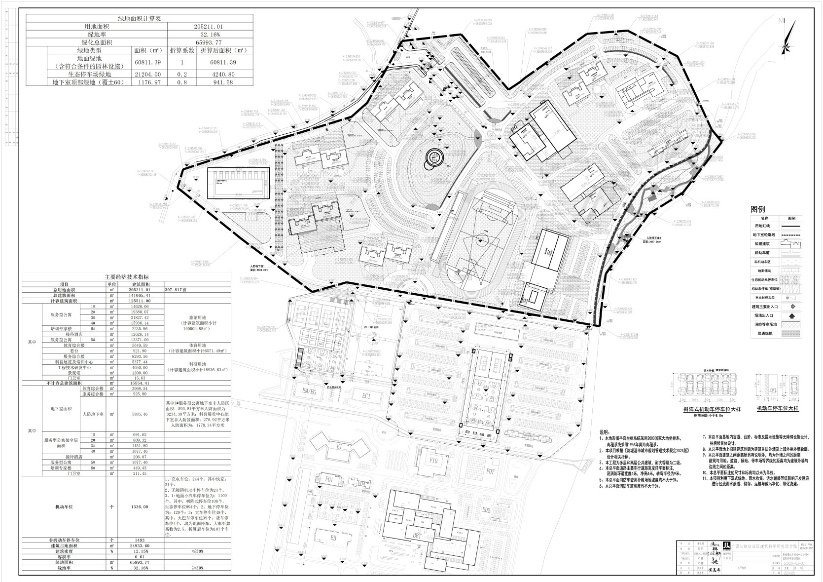 总用地面积205211.01㎡(合307.817亩),总建筑面积141065.41㎡,计容总建筑面积125511.00㎡(其中服务型公寓85140.78㎡,培训专家楼2235.96㎡,接待酒店12626.14㎡,体育综合楼5649.59㎡,服务综合楼8293.56㎡,门卫室15.63㎡,科普展览及培训中心5377.44㎡,工程技术研发中心4050.00㎡,景观塔1200.00㎡,看台921.90㎡),不计容积率总建筑面积15554.41㎡(其中地下室体育综合楼3068.54㎡,服务综合楼925.80㎡,人防地下室5885.46㎡,服务型公寓架空层1号楼691.62㎡、2号楼809.32㎡、3号楼1151.80㎡、4号楼1077.46㎡、5号楼1077.46㎡,接待酒店206.07㎡,培训专家楼架空449.43㎡,门卫室架空211.45㎡),容积率0.61,建筑密度为12.15%,绿地率32.16%,机动车停车位1336个,非机动车约1493个。