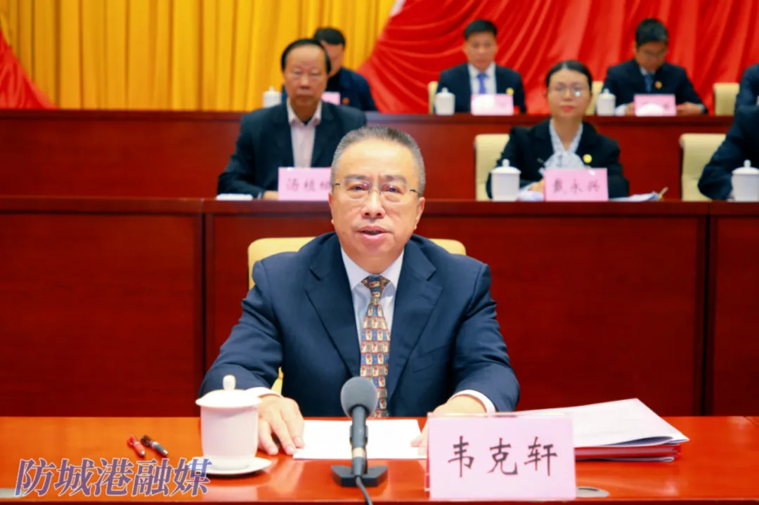 韦克轩代表自治区总工会对大会召开表示祝贺,希望防城港市各级工会组织坚持不懈用习近平新时代中国特色社会主义思想凝心铸魂,牢牢把握工会工作正确政治方向,团结引导职工群众坚定不移听党话跟党走;加快完善产业工人技能形成体系和职业发展体系,建设一流产业技术工人队伍,更好发挥劳模工匠示范引领作用;健全完善职工维权服务工作体系,不断提高服务职工群众的能力水平;深化工会改革和建设,健全完善联系广泛、服务职工的工会工作体系,发挥党联系职工群众的桥梁纽带作用,不断开创防城港市工会工作新局面。