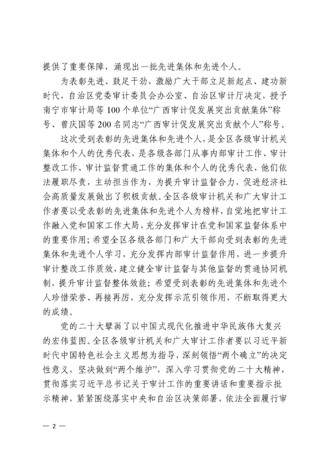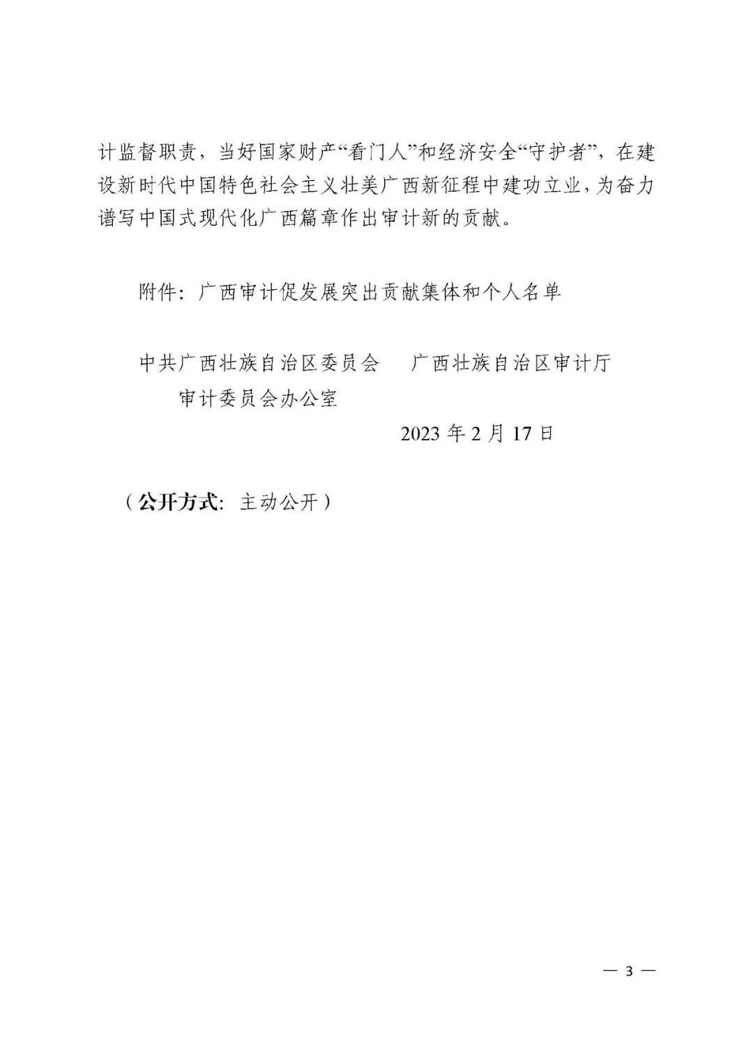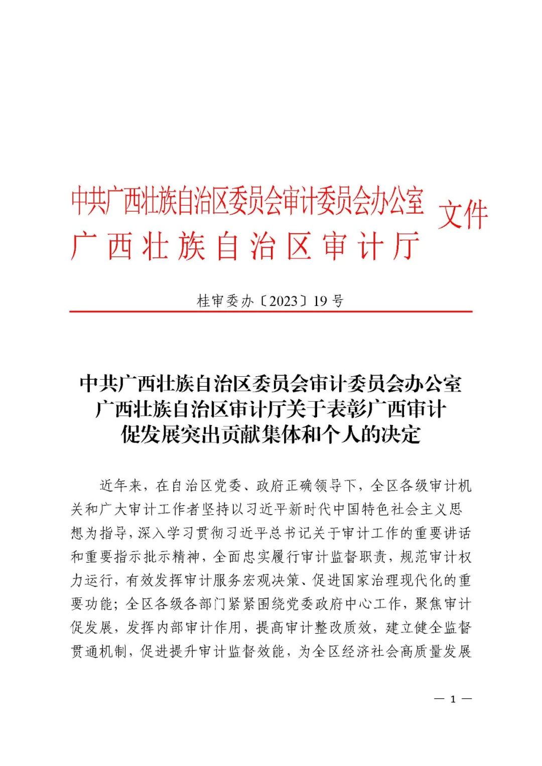 近日,自治区党委审计委员会办公室、自治区审计厅决定,授予100 个单位“广西审计促发展突出贡献集体”、200 名同志“广西审计促发展突出贡献个人”等荣誉称号!