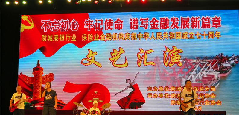 9月24日,防城港银行业、保险业金融机构庆祝中华人民共和国成立70周年文艺汇演在市文化艺术中心精彩上演。整台汇演以庆祝新中国成立 70 周年为主题内容,宣传党的十九大精神,讴歌新中国成立 70 周年以来防城港市经济社会发展取得的辉煌成就,弘扬民族团结进步主旋律,展示银行业、保险业金融机构干部职工向善向上的风采。