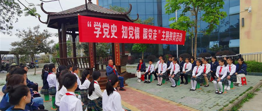 防城港市金湾小学师生们在聆听革命先烈的后代讲述“三光企”的战斗故事。