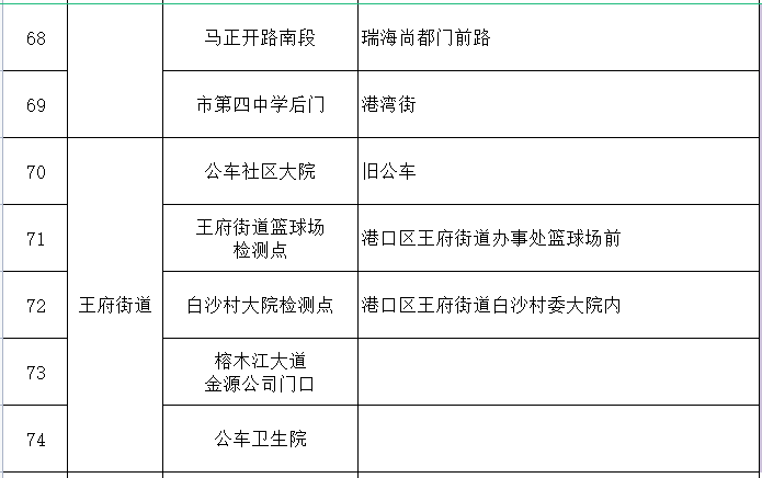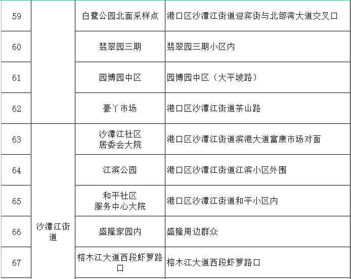 二、采样地点。在企沙镇、光坡镇、渔洲坪街道、沙潭江街道、白沙万街道、王府街道共设103个采样点(详见附件)。