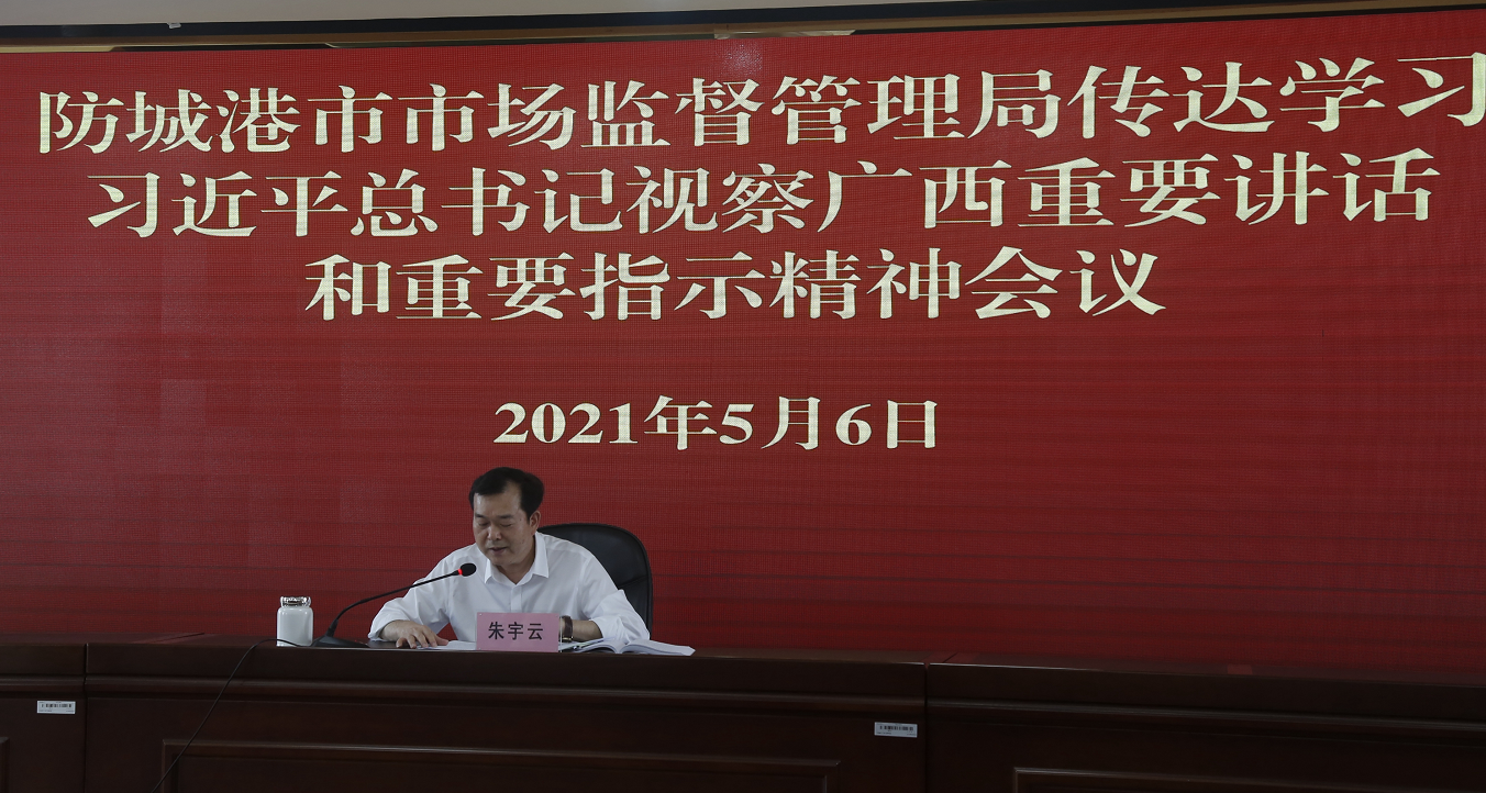 5月6日下午,防城港市市场监管局党组召开专题会议,传达学习习近平总书记视察广西时的重要讲话和重要指示精神以及4月29日全区领导干部大会精神,部署贯彻落实工作。防城港市市场监管局党组书记、市二级巡视员朱宇云主持会议并讲话。