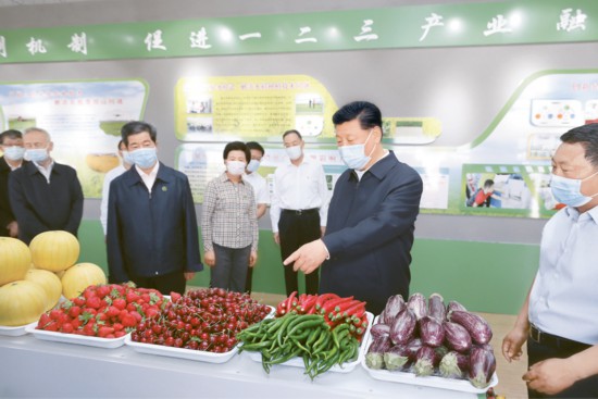 2020年6月8日至10日,中共中央总书记、国家主席、中央军委主席习近平在宁夏考察。这是6月9日下午,习近平在银川市贺兰县稻渔空间乡村生态观光园,了解宁夏现代农业发展和特色农产品情况。 新华社记者 鞠鹏/摄
