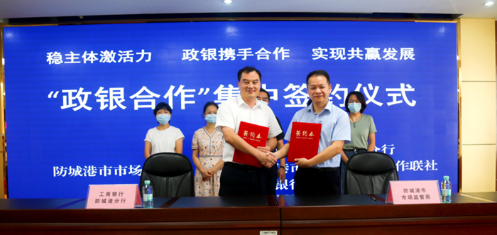 签约仪式上,防城港市市场监管局党组书记、局长、一级调研员禤东分别与北部湾银行防城港分行、防城港市区农村信用合作联社、工商银行防城港分行等主要领导签订了战略合作协议。