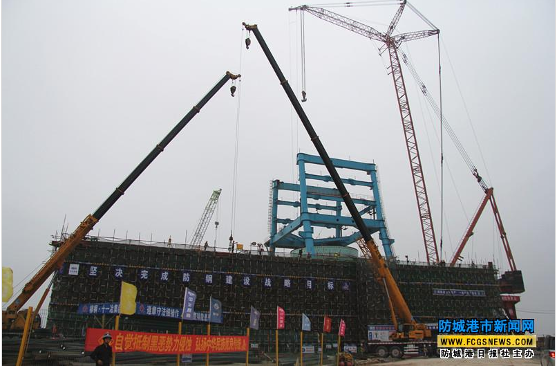 站在位于港口区企沙镇广西钢铁集团管控中心5层顶楼上向外眺望,但见打桩机在“咚咚”作响,吊车铁臂“林立”,钩机挥舞巨钩,卡车在不停地穿梭;路旁一条巨幅标语——“建设防城港钢铁精品新基地 引领广西冶金工业‘二次创业’”,时刻在提醒着建设者们真抓实干、加快进度。