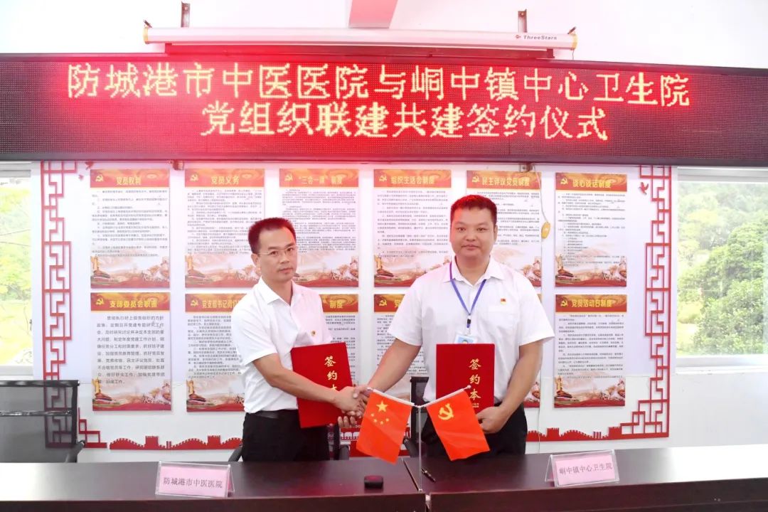 防城港市中医医院行政第一党支部书记韦雄师与防城区峒中镇中心卫生院党支部书记邓祖鑫分别就双方党支部及工作情况进行介绍。围绕如何加强党建共建、资源共享、优势互补等开展交流,并签订了《党建结对共建协议书》。