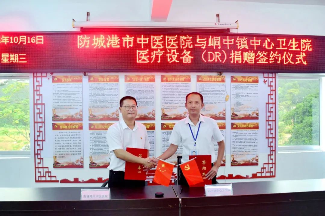 医院党委委员、副院长陈志斌与峒中镇中心卫生院领导签订医疗设备(DR)捐赠协议。