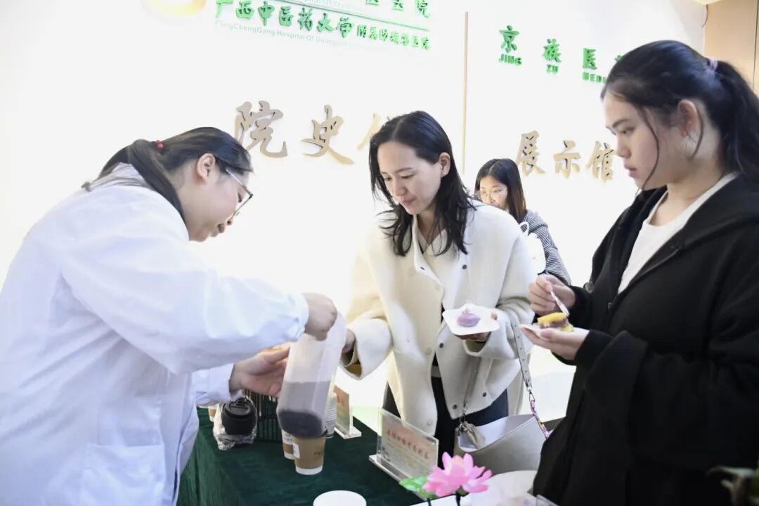 随后,在相关科室负责人的陪同和讲解下,学员们体验了数字中医,品尝了我院自制的药膳与茶饮,参观了院史馆及京族医药展示馆,并在传统医学外治中心,观摩了铜砭刮痧、督脉灸、滚蛋疗法等传统中医外治疗法。特色的疗法引起学员们的浓厚兴趣,他们不时提问,与医护人员就适应症选择以及临床治疗效果评估等方面进行深入交流。