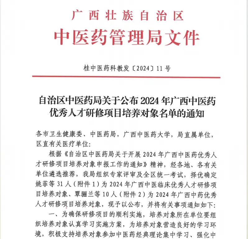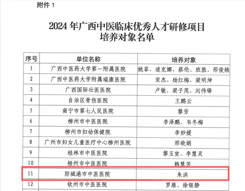 近日,自治区中医药管理局公布《2024年广西中医药优秀人才培养对象名单的通知》,我院朱洪入选2024年广西中医临床优秀人才研修项目培养对象。