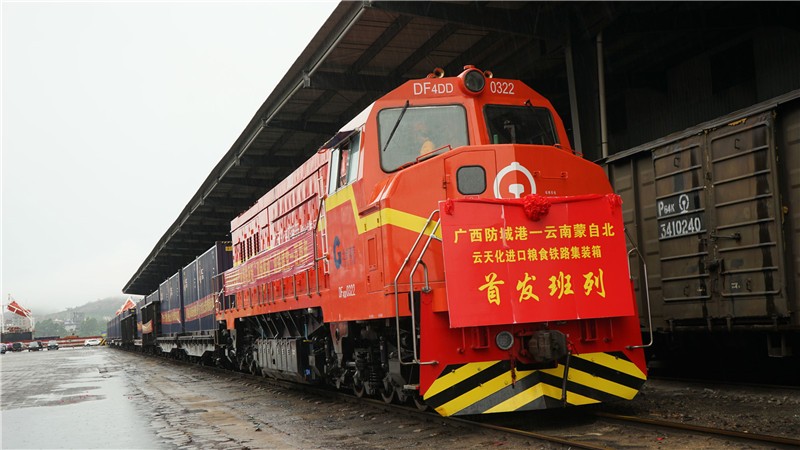 6月25日11时18分,伴随着悠长的鸣笛声,一列满载近2000吨玉米的集装箱班列从防城港码头缓缓驶出,前往云南蒙自市(见图)。