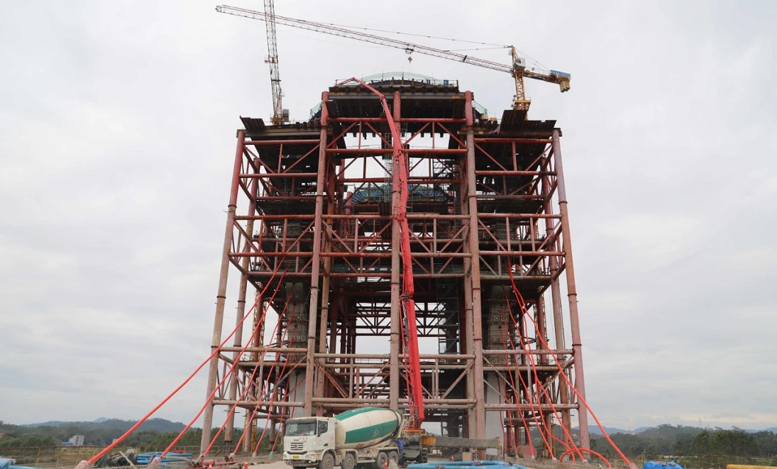 文昌大桥位于防城江上,连接河西新区和防城区,全长840米。文昌大桥主塔是以我市市花金花茶为设计依据,整个主塔形似金花茶盛开状。本次主塔合拢段顺利浇筑完成,标志着防城港市地标性建筑“金花茶”初现雏形,同时也标志着文昌大桥主体工程最重最难部分施工完成,为后续斜拉索张拉工序提供有利保障,为全桥贯通打下坚实基础。