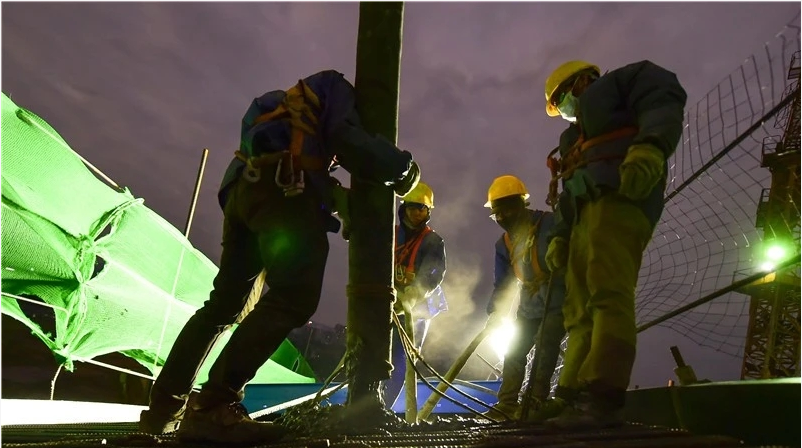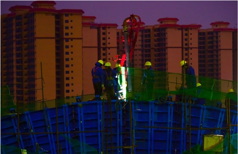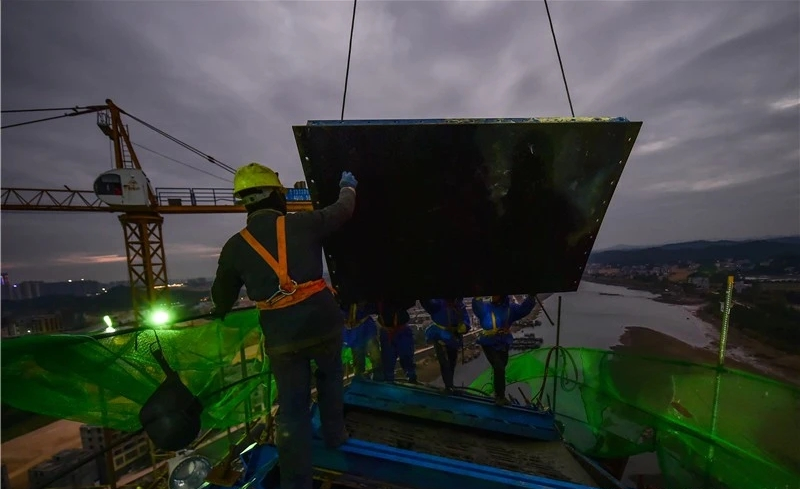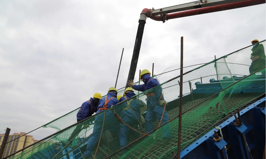 12月18日晚,文昌大桥50多米高的主塔上最后一罐混凝土浇筑完工,标志着文昌大桥主塔顺利合龙。