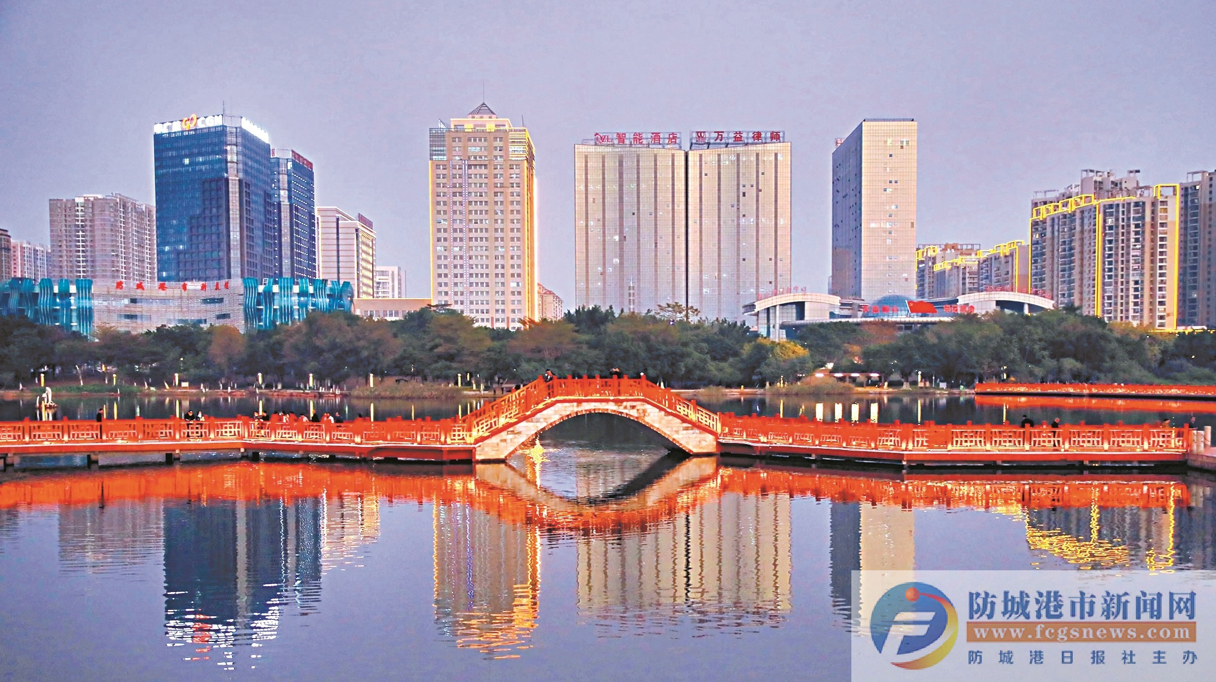 华灯初上,焕然一新的内湖栈桥犹如一条身披红霞的巨龙蜿蜒于湖面之上。本报记者 韦荣合 摄