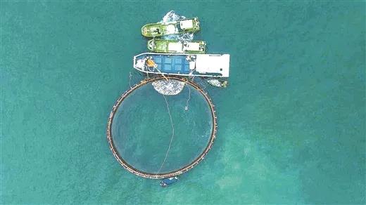 防城港海洋渔业取得长足发展。图为渔船在大型深海网箱前捕捞作业。
