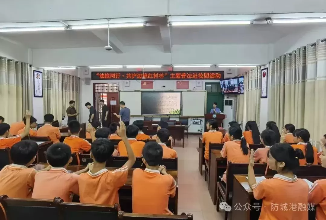 2024年6月,防城港市人民检察院联合防城港市人民法院、北仑河口国家级自然保护区管理处和东兴市人民法院,在东兴市松柏中学开展红树林普法进校园活动。曹栋兴 摄