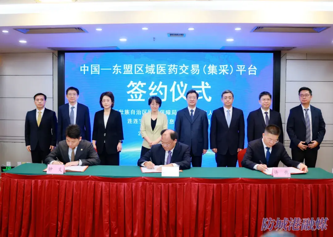 9月16日,由防城港市人民政府、自治区医疗保障局联合主办的中国—东盟区域医药交易(集采)平台推介会在南宁举行。图为眭国华、施子海、黄江、庞军等领导共同见证自治区医疗保障局、防城港市人民政府与连连宝(杭州)信息技术有限公司签署战略合作协议。记者 韦荣合 摄