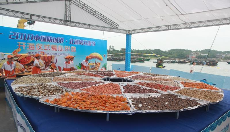 8月18日,在2018中国·北部湾开海节现场,东道主防城港除了给游客们准备了丰盛的文化大餐之外,也备下了美味的海鲜盛宴。最吸人眼球的莫过于企沙渔港原生态海鲜嘉年华和直径达6米的超大海鲜拼盘了。