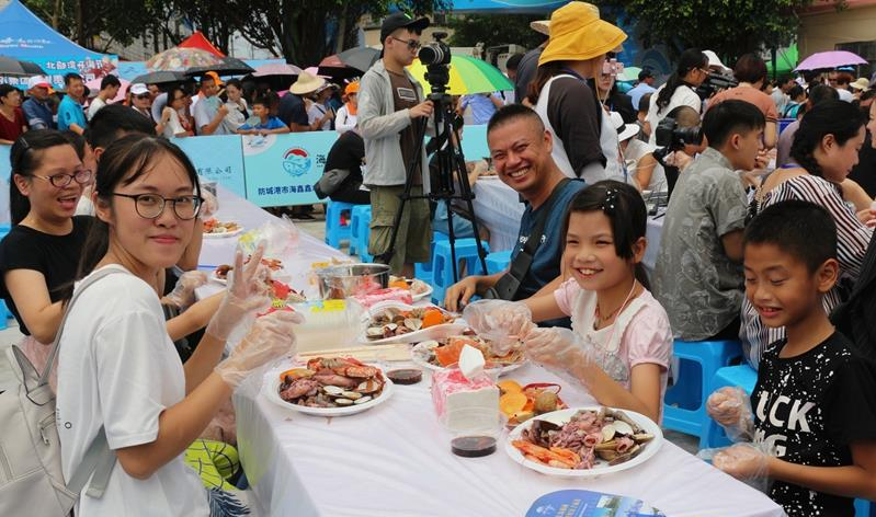 “海鲜渔歌 宴请世界”。海鲜大拼盘无疑成了此次活动的重头戏之一。据了解,这个海鲜大拼盘直径达6米,主办方为此次活动准备了超250公斤的熟食原生态新鲜海鲜,包括扇贝、濑尿虾、鱿鱼、花甲螺等12种海鲜。海鲜大拼盘的海鲜供游客现场有偿选购,每份售价为28元,其收益所得的50%将捐献给疍家贫困孩子。