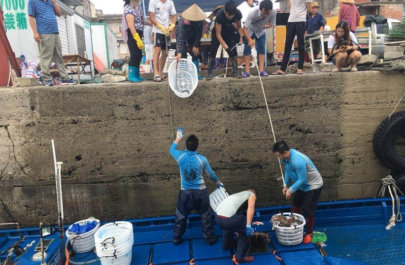 一大早,渔民们用小艇从渔船上把海鲜运送上岸