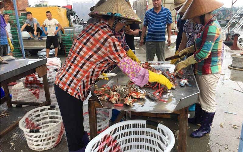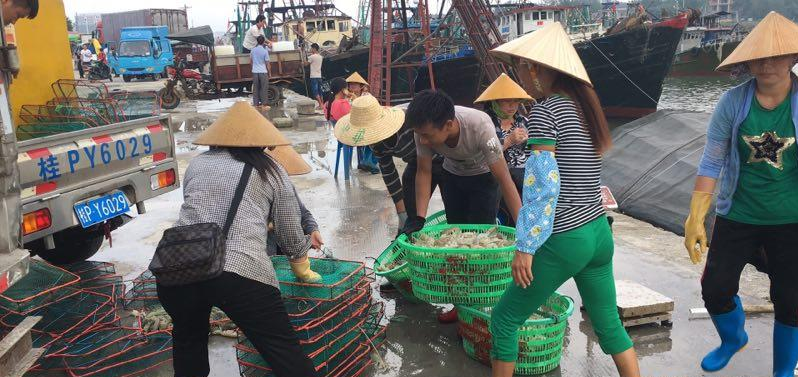 趁新鲜,客商把刚刚上岸的海鲜马上装车,运往南宁