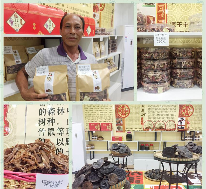 上思县南屏瑶族乡米强村特产店货架上摆满了各种包装精美的本地特产,有香菇、红菇、八角、玉桂、灵芝等土特产。这些特产都是本地村民到山里采回来晒干,拿到土特产店进行包装售卖。这些产品都是野生纯天然的产品,通过网络销往全国各地,深受广大消费者喜爱。