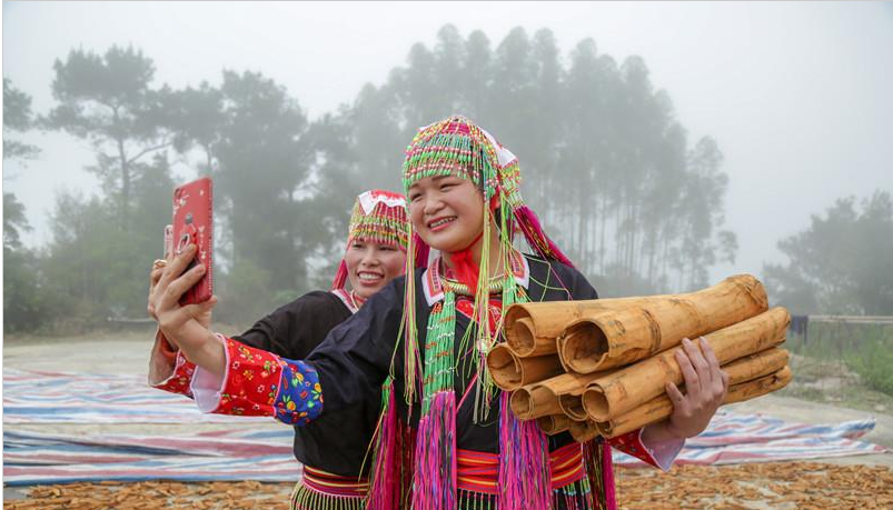 近日,在上思县南屏瑶族乡枯叫村肉桂晒场上,两个瑶族妇女抱着金黄的桂皮自拍。