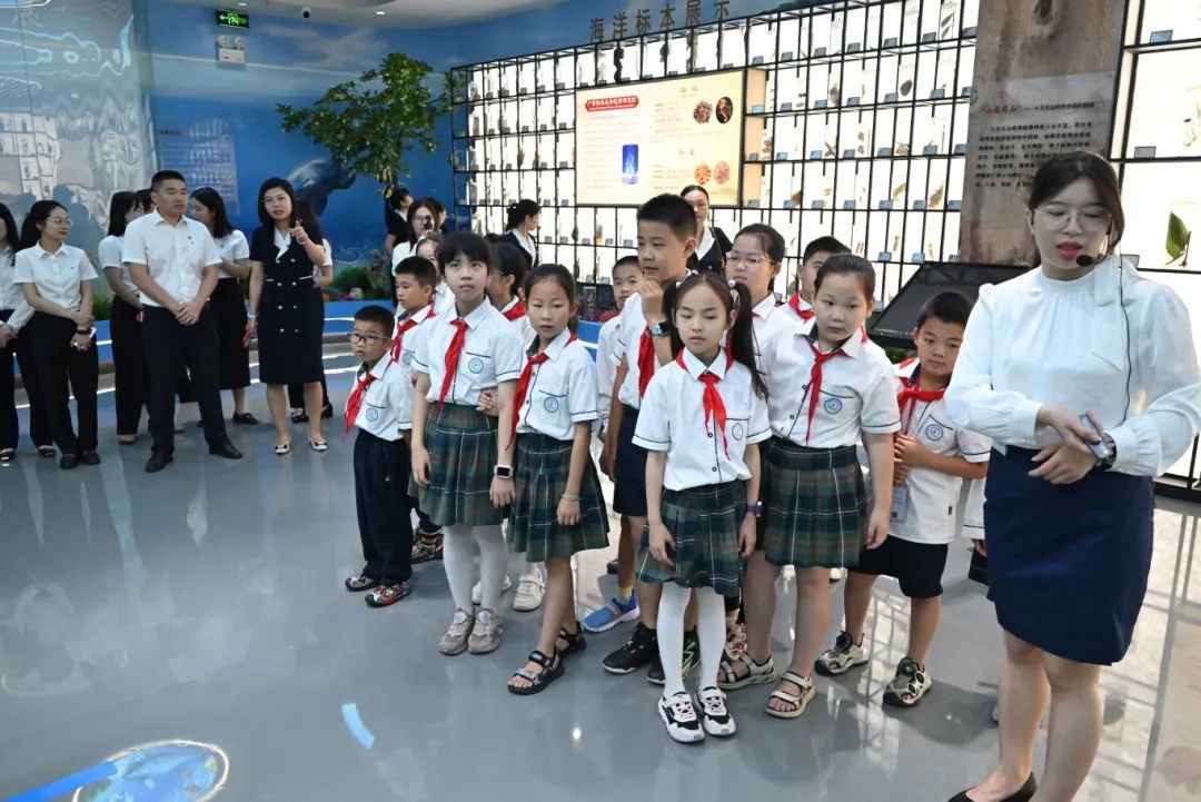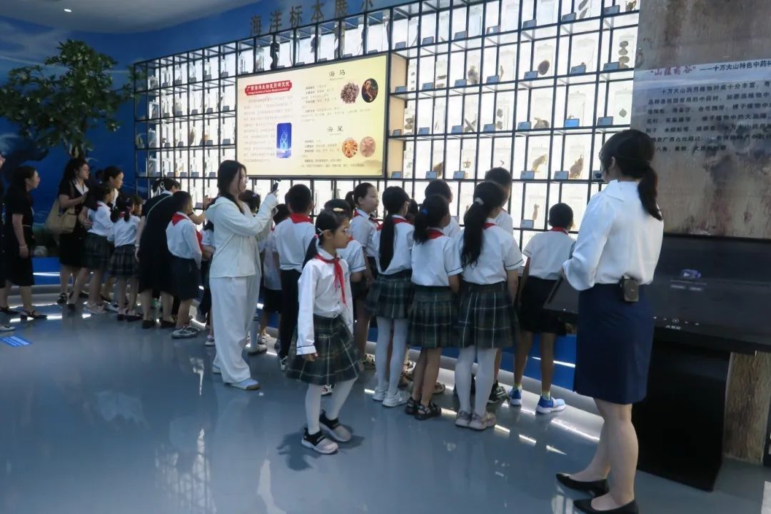 活动在传统中医药展厅拉开帷幕。金湾小学学生们身着整齐校服,在党员志愿者的带领下,开启了一场生动的中医药文化探索之旅。展厅内陈列着海洋生物标本、药材标本、动植物生态链模型、历史图文和互动设备等丰富展品,让孩子们全方位了解了中医药的悠久历史和独特价值。“小小药师”实践环节中,孩子们亲手称量药材、辨识药性,不时发出“原来蚯蚓也能入药”“金花茶有那么多药效”等新奇发现,现场充满浓厚的求知氛围。