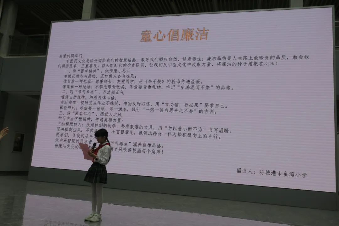 随后,大家移步至食品安全与健康平台,围绕廉洁主题开展了系列创意互动活动。在“廉洁谜语猜猜乐”环节中,“廉洁自律,一尘不染--白芷”“拒腐蚀,永不沾--黄连”等谜语将中药知识与廉洁巧妙结合,引发孩子们踊跃抢答。学生代表宣读了《童心倡廉洁》倡议书,用稚嫩而坚定的声音传递着清廉理念。