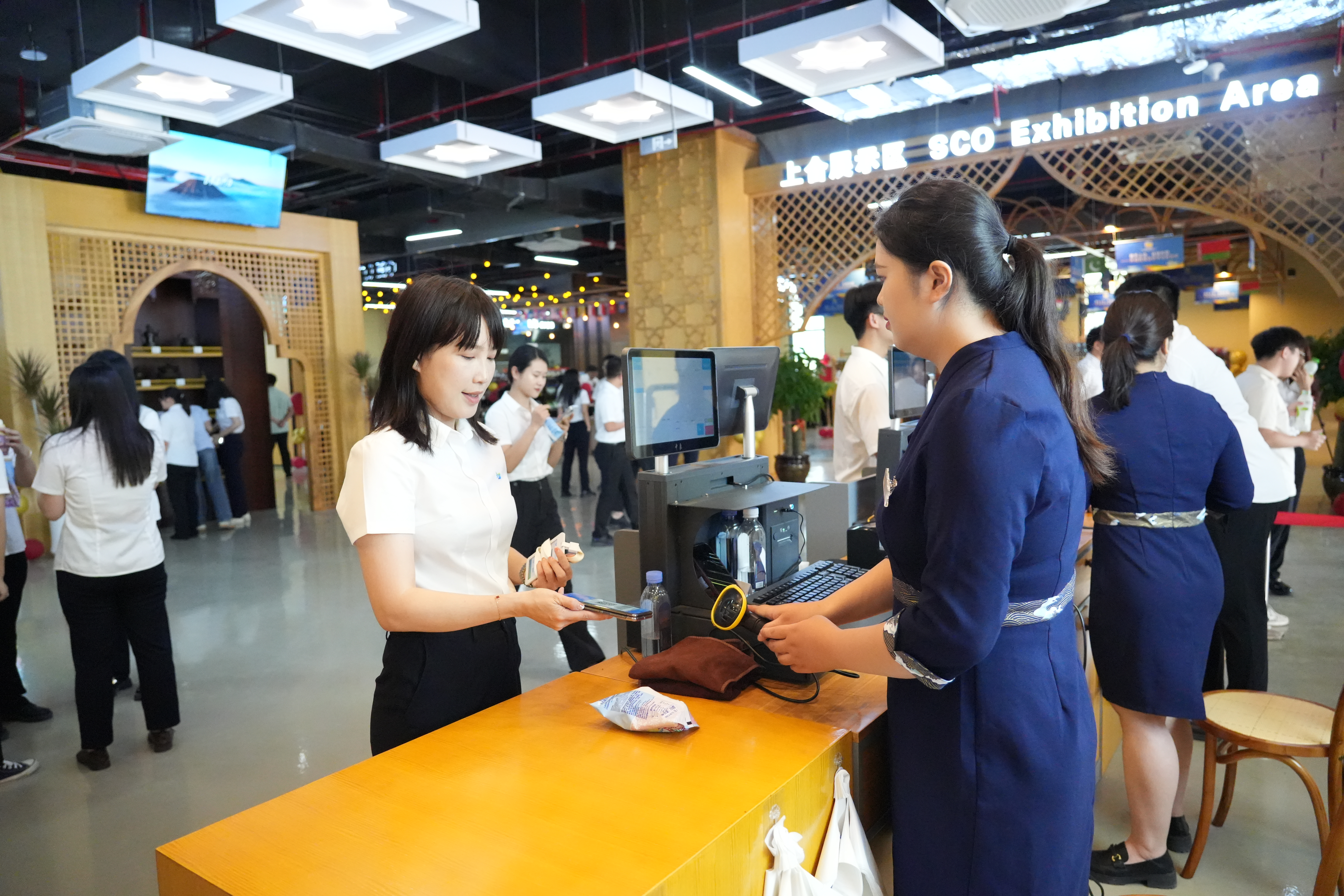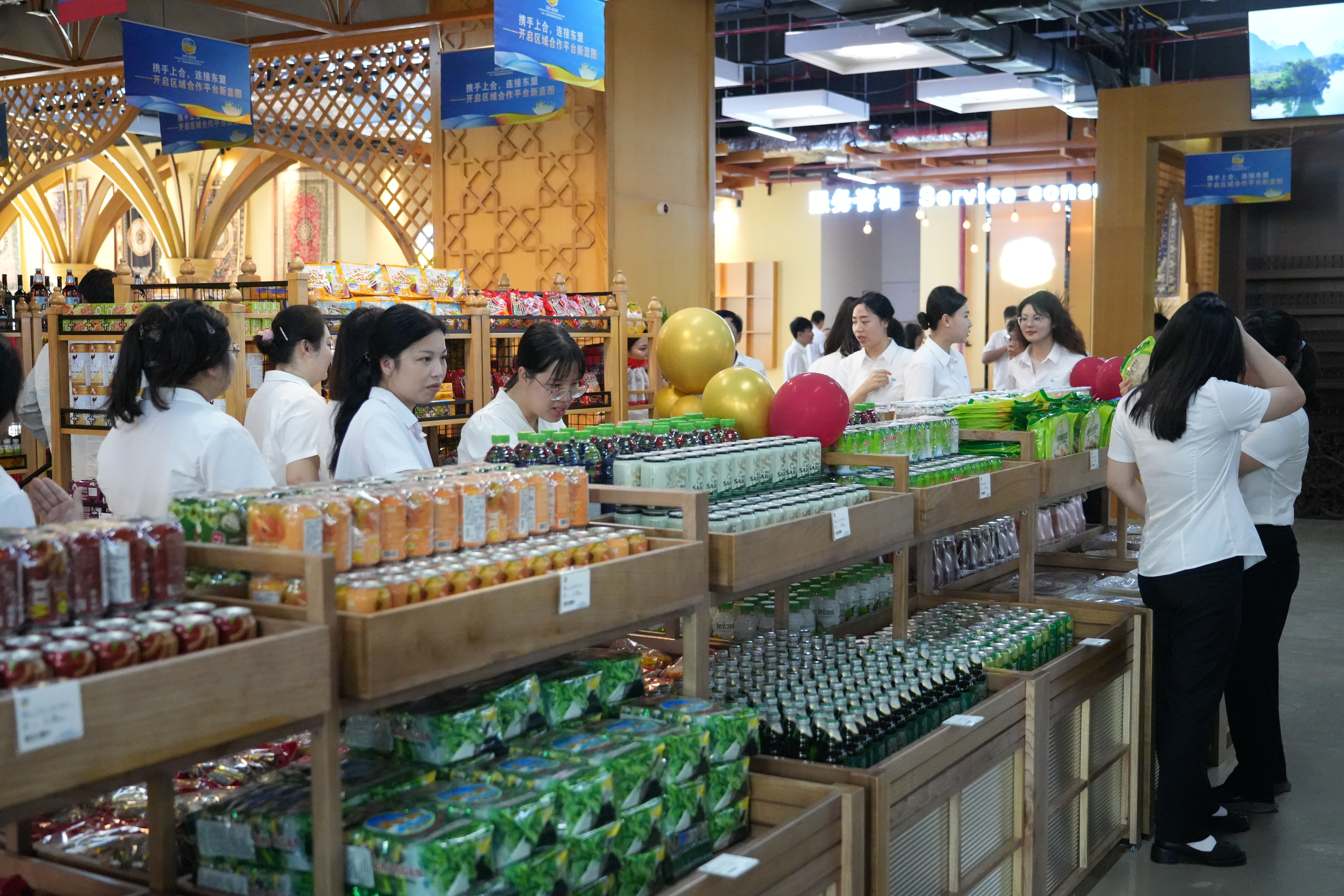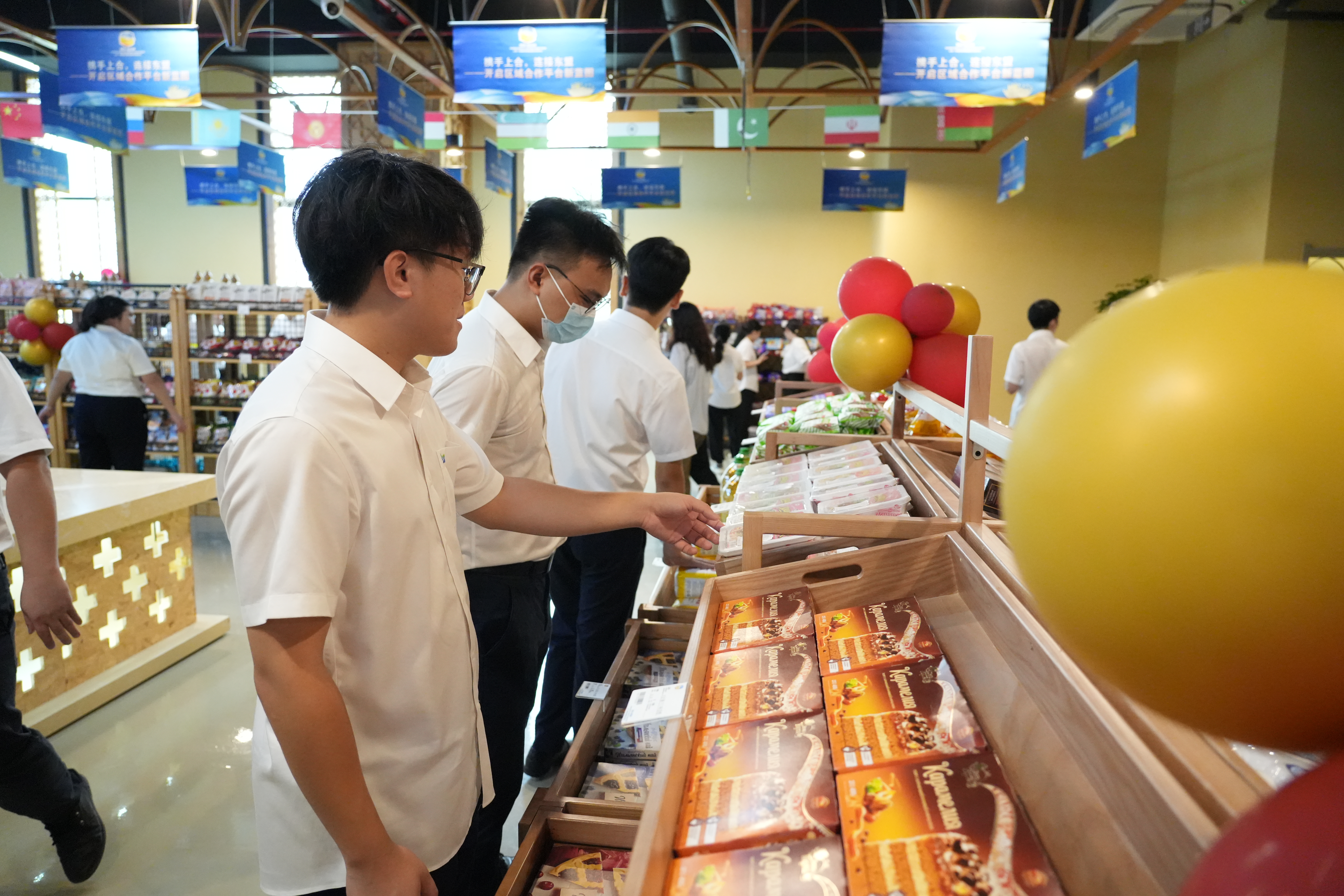 仪式上,集团党委副书记、副董事长、总经理傅现宣布上合-东盟特色商品展示交易中心正式揭牌,集团领导班子共同为交易中心揭牌。全体干部职工参观上合-东盟特色商品展示交易中心。