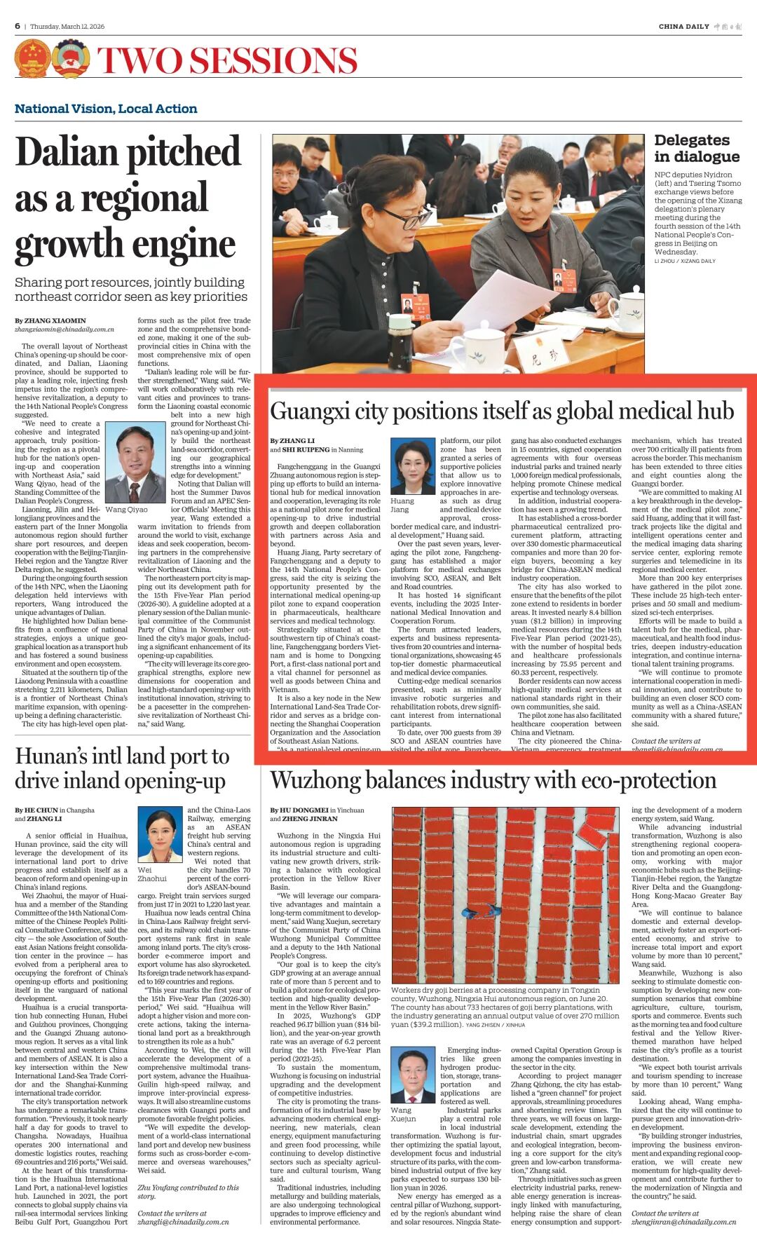 3月12日,中国日报“两会Two Sessions”专刊“中国式现代化地方实践专栏(Nation Vision, Local Action)刊发全国人大代表、防城港市委书记黄江专访稿件,文章指出,当前防城港市正全力打造国际医学创新合作新高地,以国际医学开放试验区建设为引擎,推动产业发展,不断扩大面向东盟地区以及上合组织国家的国际“朋友圈”。