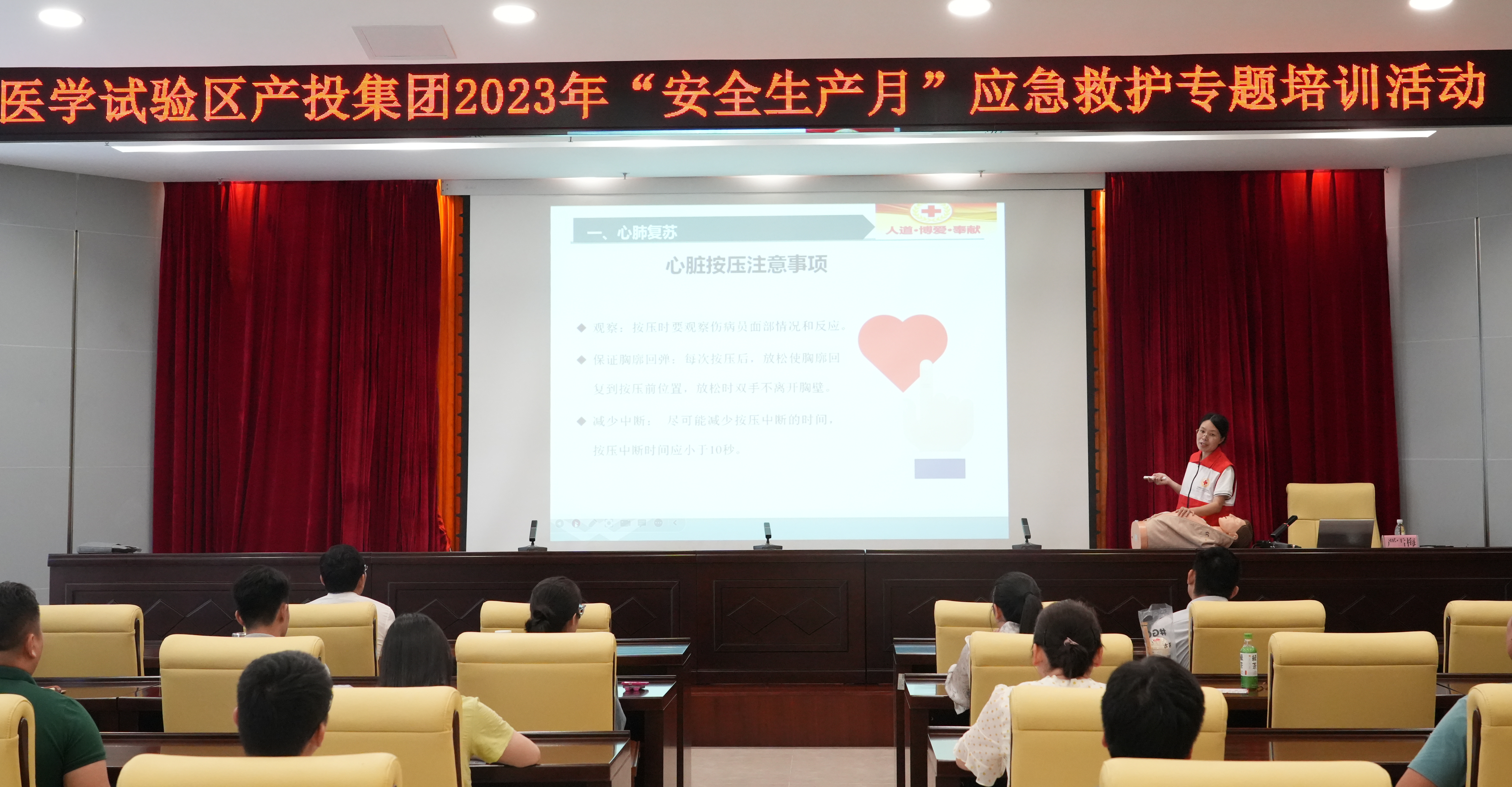 2023年6月是全国第22个“安全生产月”,为切实强化集中宣传教育,营造浓厚的安全生产氛围,普及急救知识,提高各单位和个人在突发事件中的自救、互救能力,6月29日,医学试验区产投集团围绕“人人讲安全、个个会应急”第22个全国“安全生产月”主题,在医学赋能中心开展2023年“安全生产月”应急救护专题培训活动。集团公司各部室、各子公司约60人参加培训。