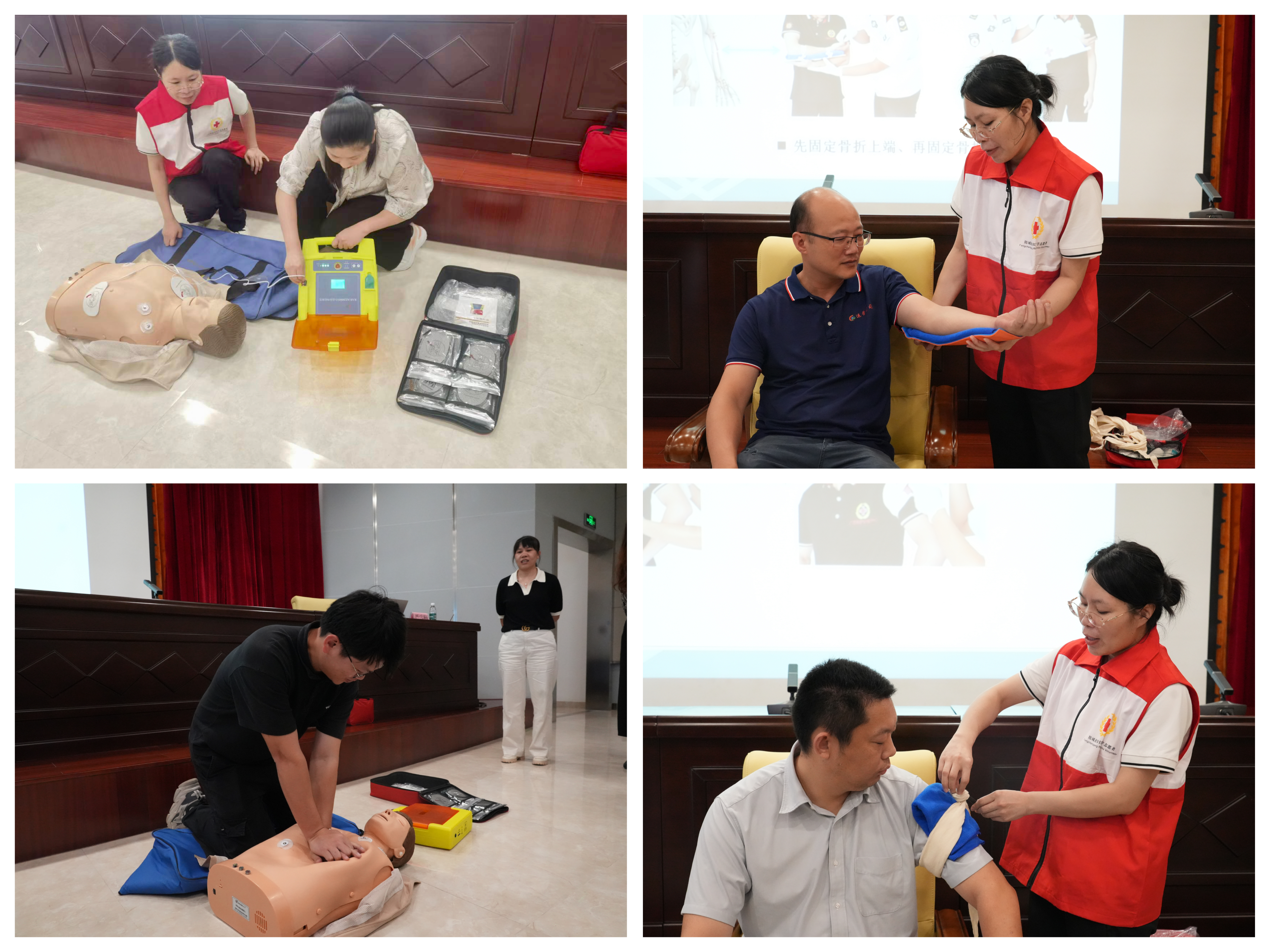 此次培训活动邀请了防城港市红十字会应急救护师严雪梅老师进行授课。她呼吁单位和个人一定要把安全生产工作摆在首要位置,争取做到“人人讲安全,个个会应急”,普及好急救知识,提升应对突发事件和意外伤害的应变和处置能力,在面临意外时能及时、有效地开展自救、互救,为自己和他人的生命健康与安全保驾护航。培训采取“理论教学+实操”的形式,严雪梅老师生动形象地讲解了心肺复苏、创伤止血包扎、骨折固定以及AED使用等急救知识,并以模拟橡胶人为器具,现场演示了正确的心肺按压和人工呼吸方式,以及AED的正确使用方式。