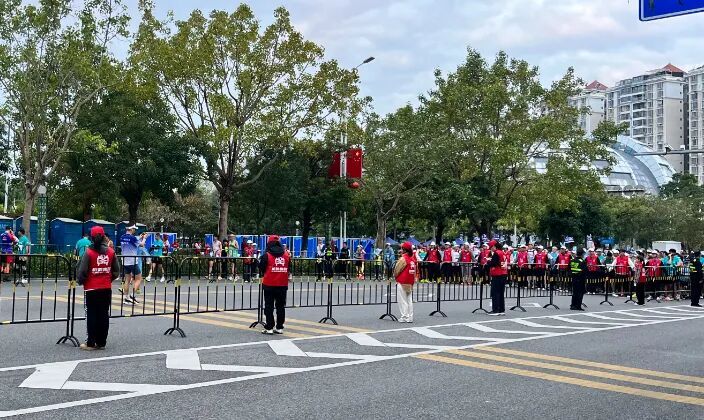 随着发令枪响,选手们奋勇出发,赛道沿线顿时沸腾。补给站内,志愿者们有序分发饮用水、运动饮料和能量食品,及时清理场地,热情地为选手们呐喊助威,注入源源不断的精神动力。他们同时承担维护秩序职责,引导观众文明观赛,及时劝阻越线行为,耐心讲解比赛规则,并在关键路口以清晰的手势和响亮的提示声,为选手们指引方向,全力保障赛事安全顺畅进行。当选手们陆续冲过终点,志愿者们第一时间送上毛巾、鲜花与诚挚祝贺,协助完赛选手拉伸放松,为体力透支的选手提供座椅、饮水及基础护理,部分具备急救知识的志愿者积极配合医护人员开展初步处置,以专业细致的服务赢得了选手们的广泛赞誉。