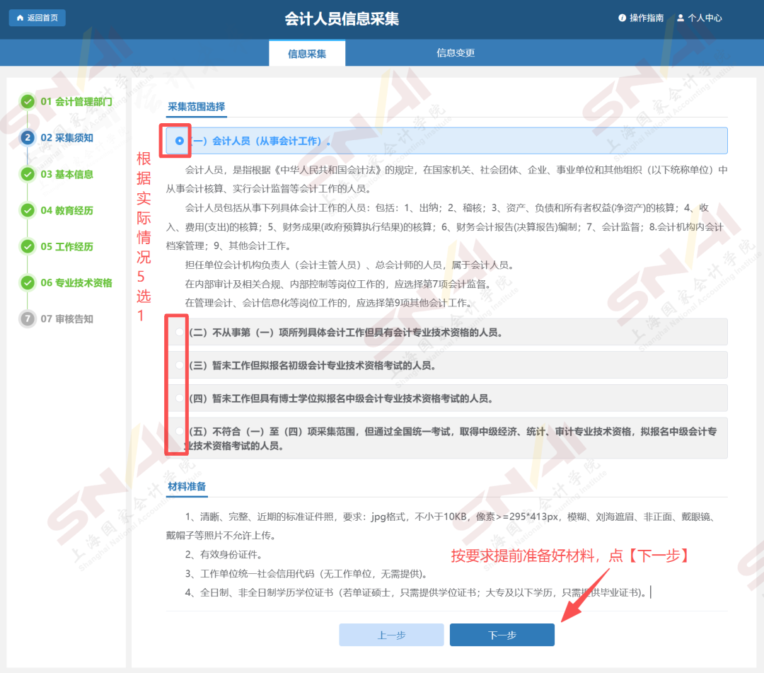 2.采集须知(身份勾选):严格对照五类范围选择,并按要求提前准备好材料点击进入【下一步】