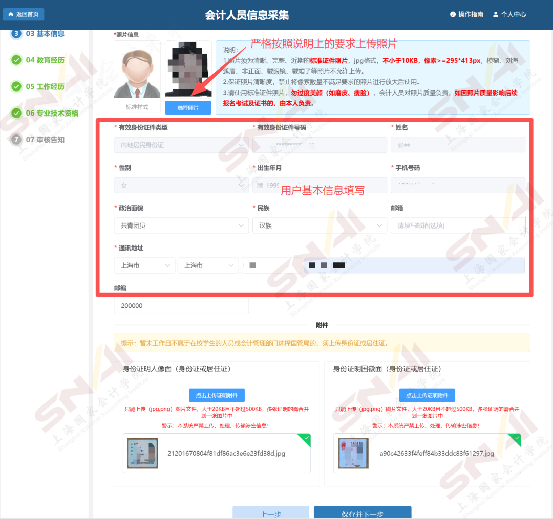 ▶ 身份证:暂未工作且不属于在校学生的人员或会计管理部门选择国管局的,须上传身份证或居住证。正反面彩色拍照/扫描(大于20KB且不超过500KB)