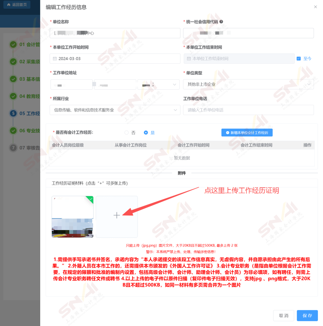 当前工作经历:需填写当前工作单位信息,上传本人签署的工作经历承诺书(可参照以下模板,请注意!工作经历承诺书必须由本人亲笔手写签字,打印签名、电子签名等均视为无效。)