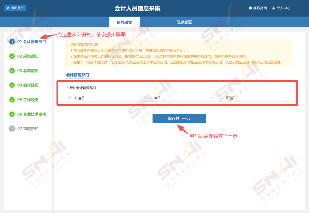 1.会计管理部门(属地选择):按"在职按工作地,非在职按户籍/居住地"原则选择省→市→区